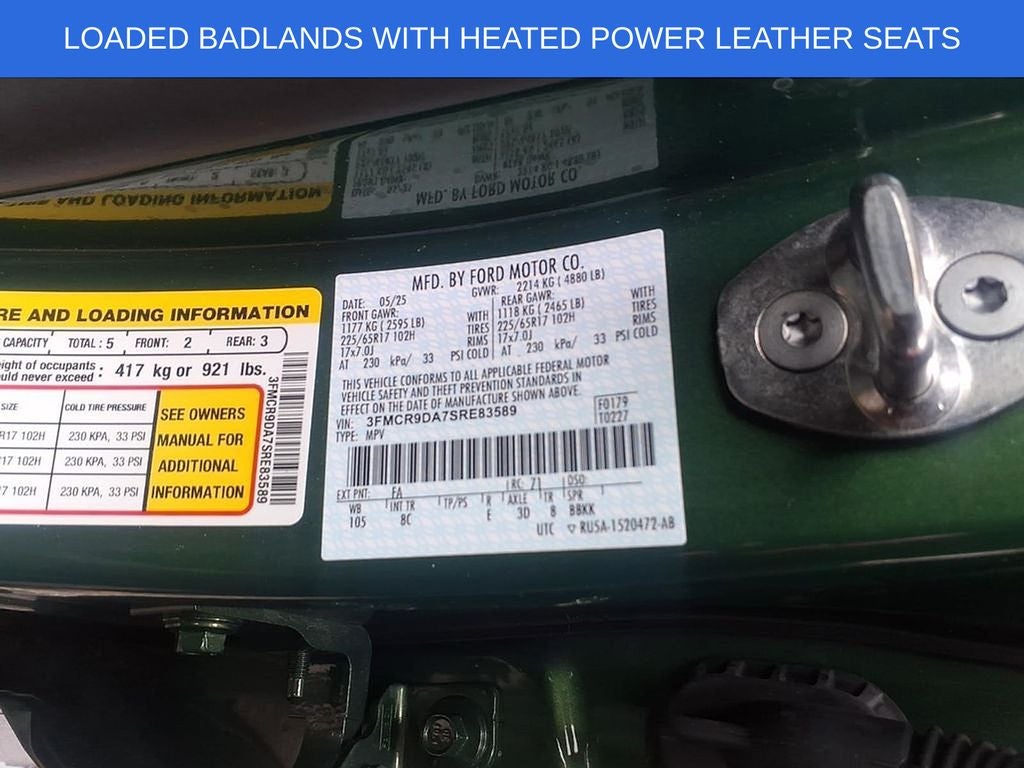 2025 Ford Bronco Sport Badlands Green Metallic 4WD 8-Speed Automatic EcoBoost 2.0L I4 GTDi DOHC Turbocharged VCT